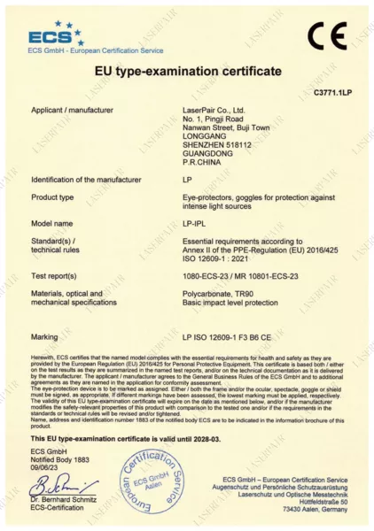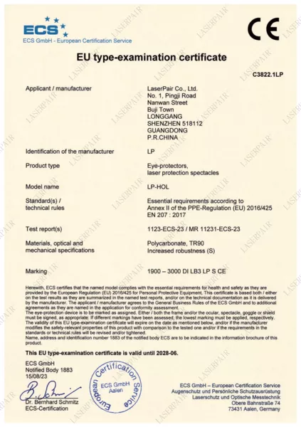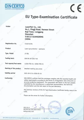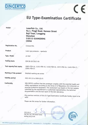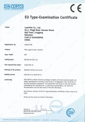 Tüm lazer gözlüklerimiz ve koruyucu bariyerlerimiz, Avrupa Birliği’nin Sağlık, Güvenlik ve Çevresel Koruma standartlarına uygun olduğunu gösteren CE işaretine sahiptir. Bu belge, ürünlerimizin 2016/425 (Kişisel Koruyucu Donanım) yönetmeliğine uygunluğunu teyit eder.