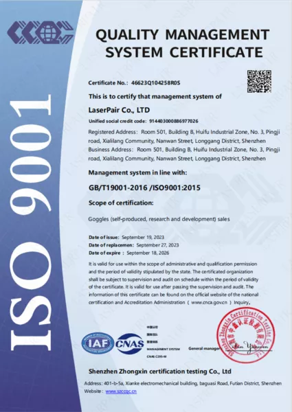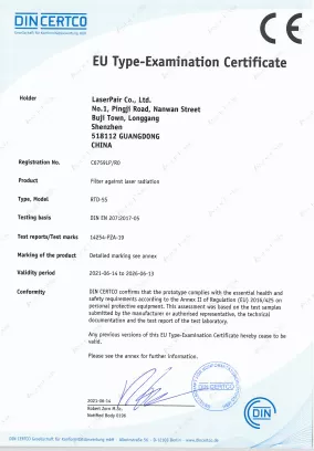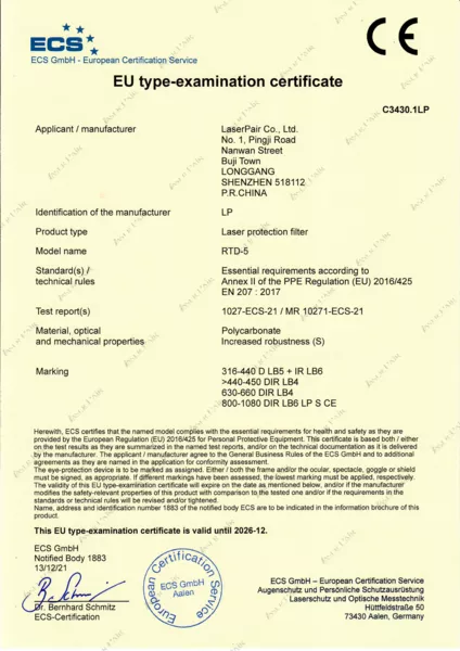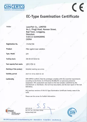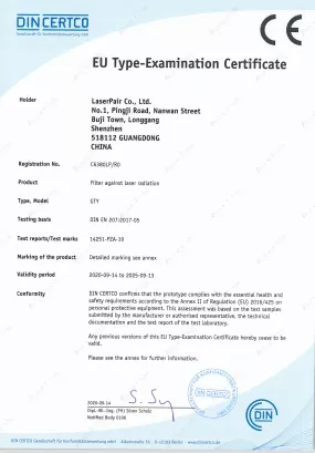 Ürünlerimizin tamamı EN 207 (Kişisel Göz Koruması – Lazer Radyasyonuna Karşı Filtreler ve Göz Koruyucuları) standardına göre test edilmekte ve sertifikalandırılmaktadır.